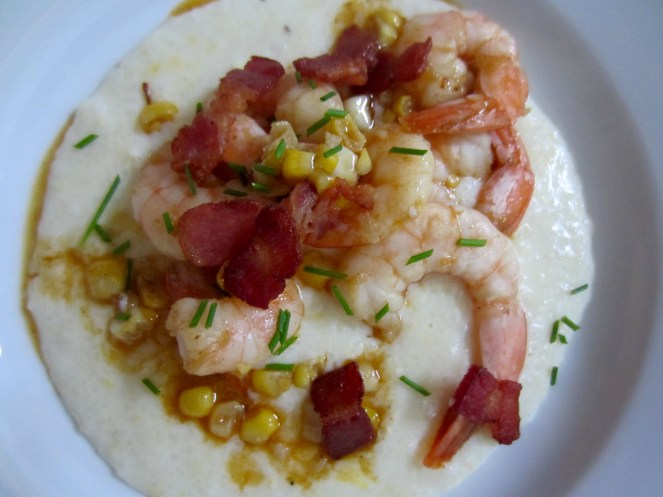 - Serve shrimp and corn over the grits; top with fresh chives and bacon lardons.