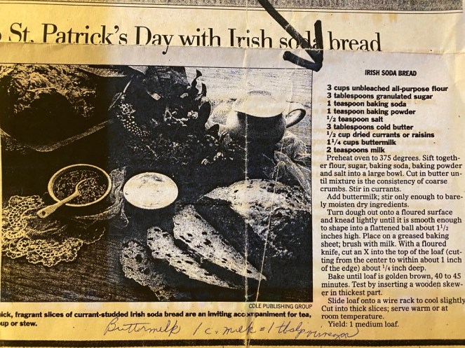 But, the real deal is this Irish Soda Bread. I make a couple versions of soda bread and I love them all. But, I first had this version at my mom’s house on St. Patty’s Day in 2019. She made it and we COULD NOT get enough of it! I don’t know where she got the recipe. She photo copied something, wrote a substitute for buttermilk on the bottom and gave it to me. I would love to give credit where credit is due… but I don’t know who to give it to other than my mom. So thanks Mom!